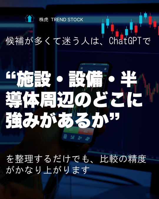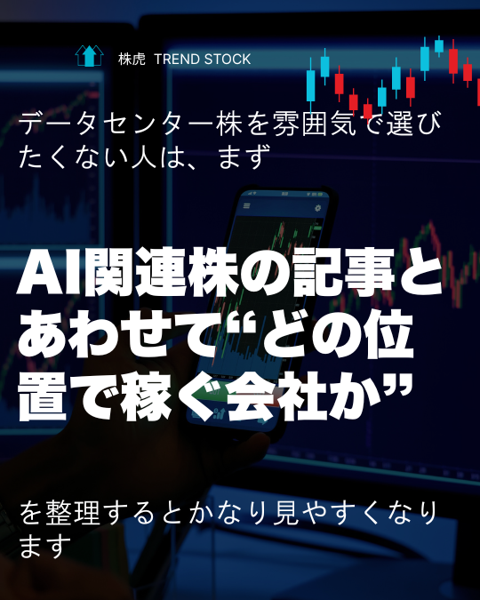 ただし、関連銘柄はかなり広く、データセンター運営、電力、冷却、通信、サーバー、半導体周辺まで含まれます。ここを整理しないと、本命株と周辺株を混同しやすくなります。