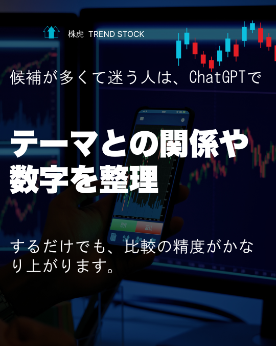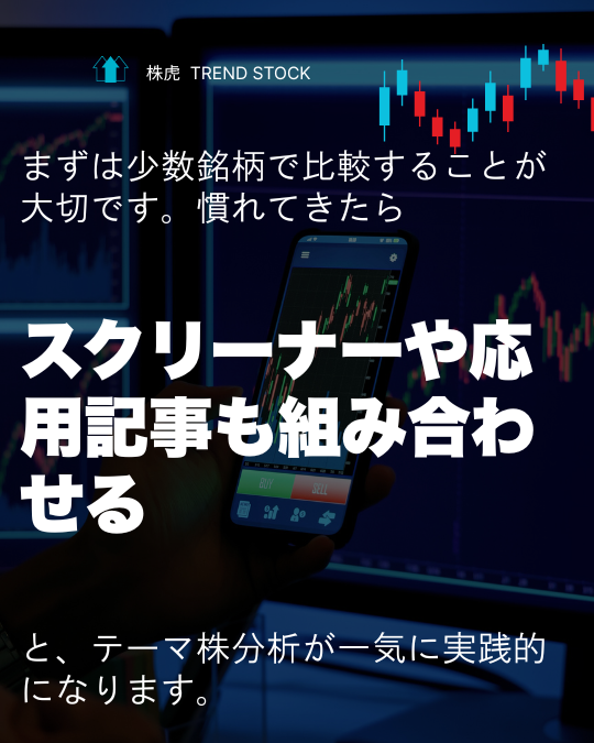 テーマ株では、本命株・出遅れ株・連想株が混ざりやすいので、最低でも2〜3社は比較した方が安全です。
